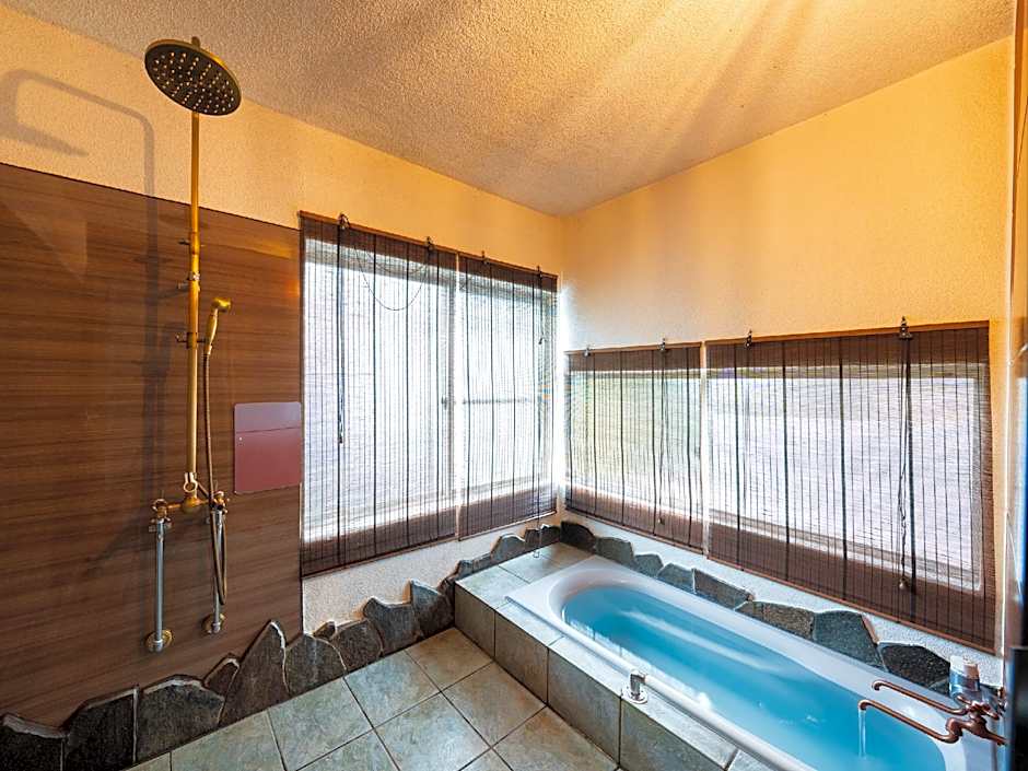 Amenities include free private parking and on-site parking, free Wifi, a streaming service (like Netflix), air conditioning, a free hot spring bath, kitchenware, a kitchenette, a garden, a bidet, free toiletries, and a bathtub.